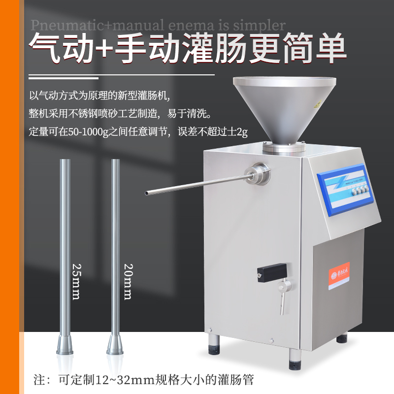 ,整機不銹鋼噴砂工藝制造,在灌火腿腸時定量可在50-1000g之間任意調(diào)節(jié)